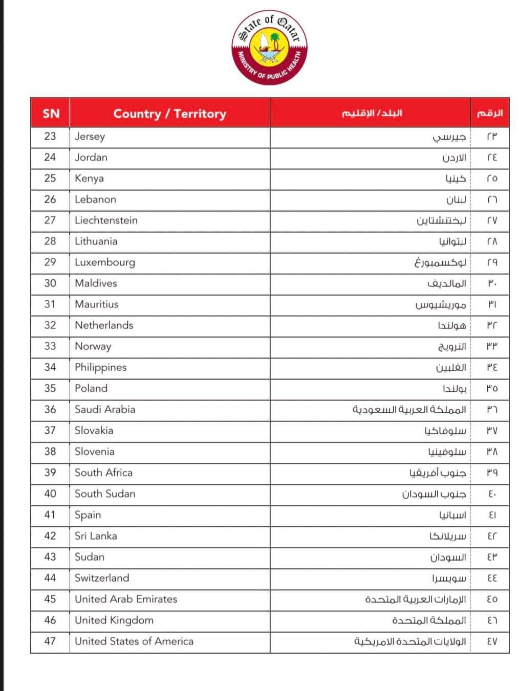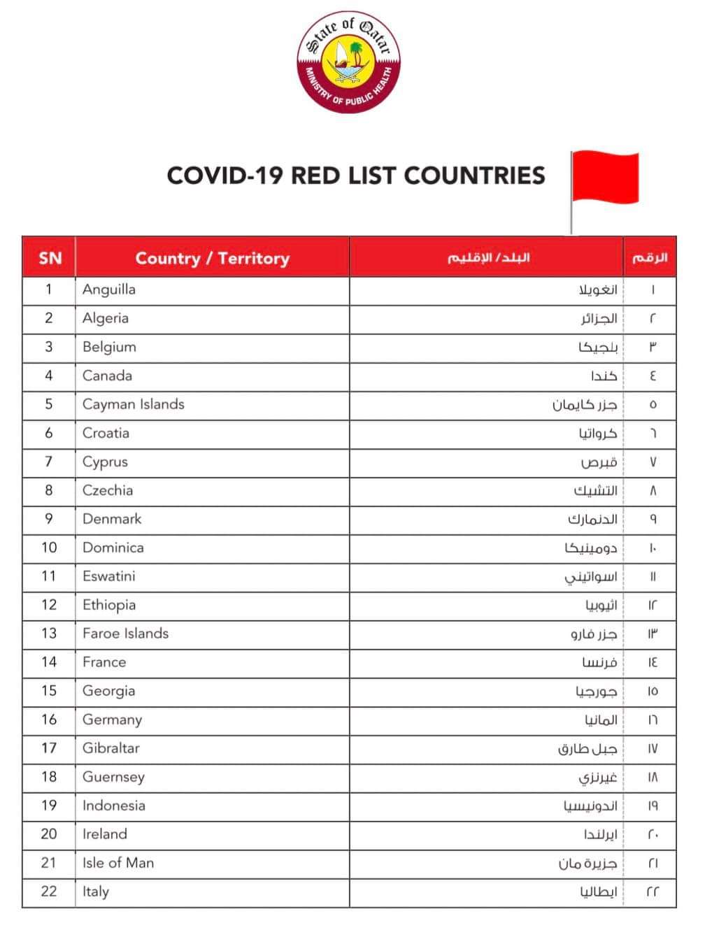 اعلنت وزارة الصحة القطرية تحديث جديد لقوائم الدول المصنفة في الخانة الحمراء حيث تضمنت 47 دولة من بينها الجزائر . واوضحت الوزارة ان هذه القائمة جاءت عقب تسجيل حالات للمتحور أوميكرون في هذه البلدان. وستدخل هذه التحديتاث حيزالتنفيد بداية من مساء السبت 01 جانفي 2022 .