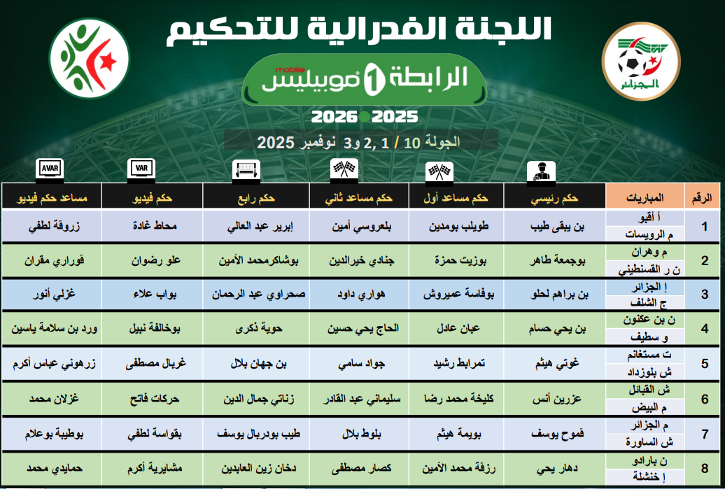 وجاءت باقي تعيينات حكام مباريات هذه الجولة العاشرة من البطولة المحترفة، كاملة، على النحو التالي:
