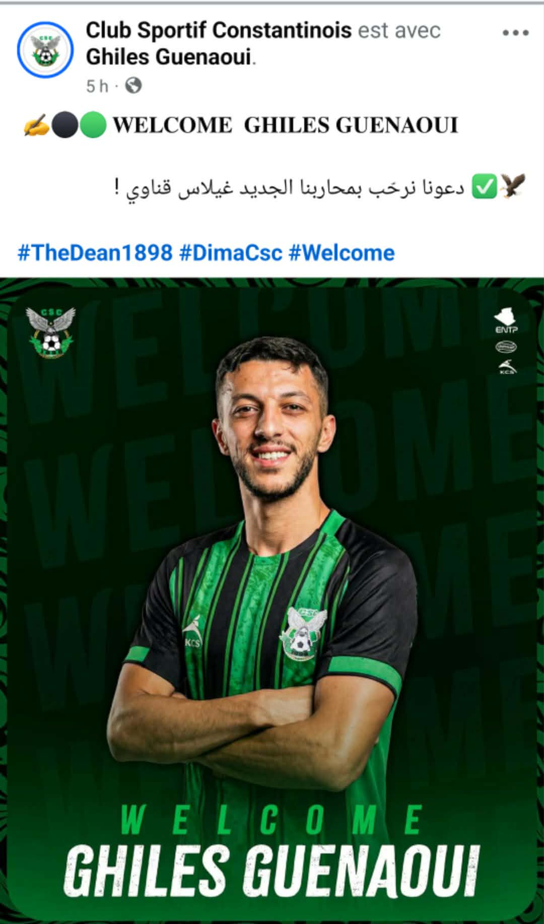 أعلنت إدارة نادي شباب قسنطينة، اليوم الثلاثاء، عن صفقة جديدة في فترة التحويلات الشتوية الحالية، ويتعلق الأمر بمتوسط الميدان الهجومي، غيلاس قناوي.