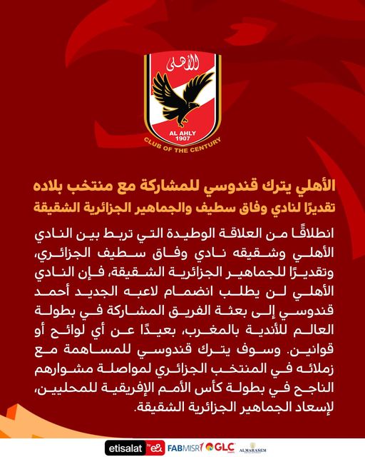 وقالت في بيان لها على الصفحة الرسمية على “الفايسبوك”. أنها لن تجبر أحمد قندوسي على الالتحاق “الأهلي المصري يترك قندوسي للمشاركة مع منتخب بلاده تقديرا لنادي وفاق سطيف و الجماهير الجزائرية الشقيقة”.