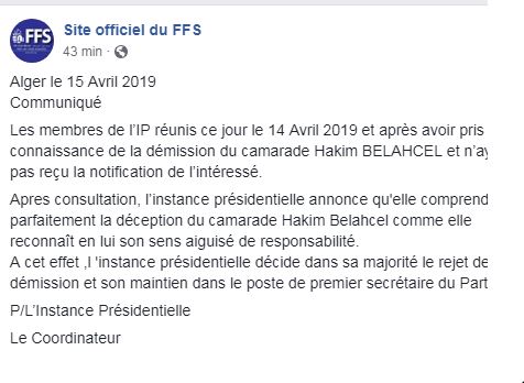 رفضت الهيئة الرئاسية لجبهة القوى الإشتراكية، استقالة السكرتير الأول للأفافاس، حكيم بلحسل من منصبه.