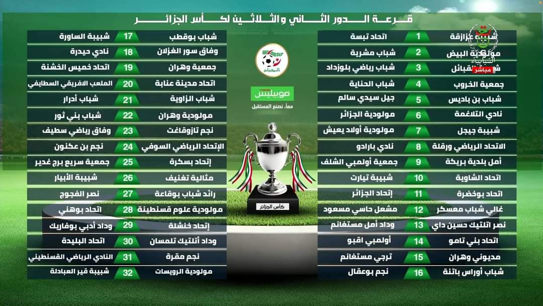 أقيمت اليوم الأحد، قرعة الدورين الـ32، والـ16، من منافسة كأس الجزائر 2024، والتي أسفرت عن مواجهات نارية واعدة.