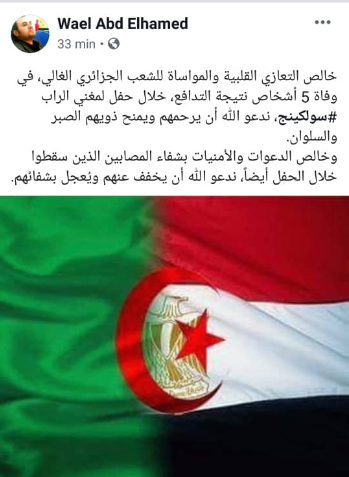 للشعب الجزائري الغالي في وفاة 5 أشخاص نتيجة التدافع، خلال حفل لمغني الراب سولكينج، ندعو الله أن