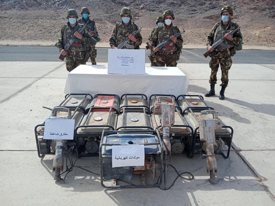 من جهة أخرى، أوقفت مفارز أخرى للجيش الوطني الشعبي بكل من تمنراست وعين ڨزام وبرج باجي مختار وجانت، 60 شخصا وحجزت10 مركبات و54 مولد كهربائي و38 مطرقة ضغط و3 أجهزة كشف عن المعادن وأغراض أخرى تستعمل في عمليات التنقيب غير المشروع عن الذهب.