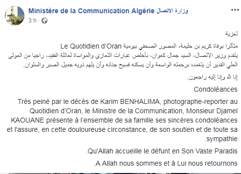 وفي منشور فايسبوكي على الصفحة الرسمية للوزارة،”متأثرا بوفاة كريم بن حليمة، المصور الصحفي بيومية Le Quotidien d’Oran”.