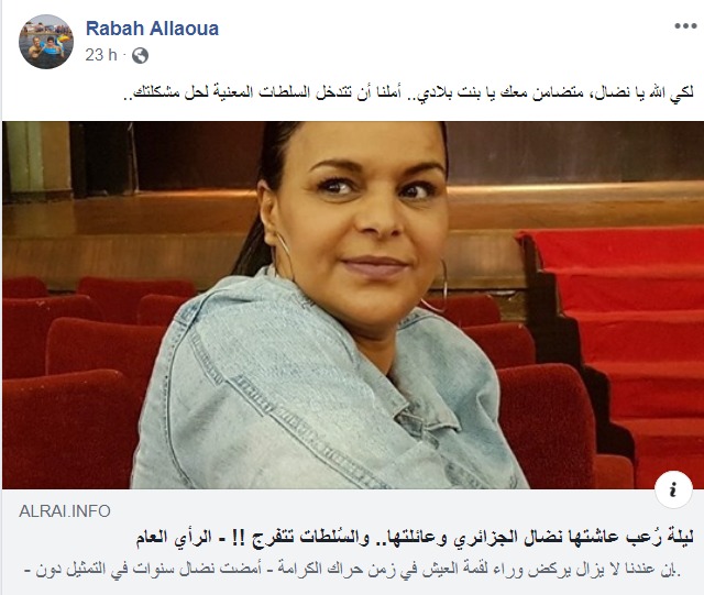 وكانت الممثلة نضال، قد ناشدت السلطات المحلية لبلدية الرغاية لمنحها سكنا يضمن لها ولأبنائها الكرامة.