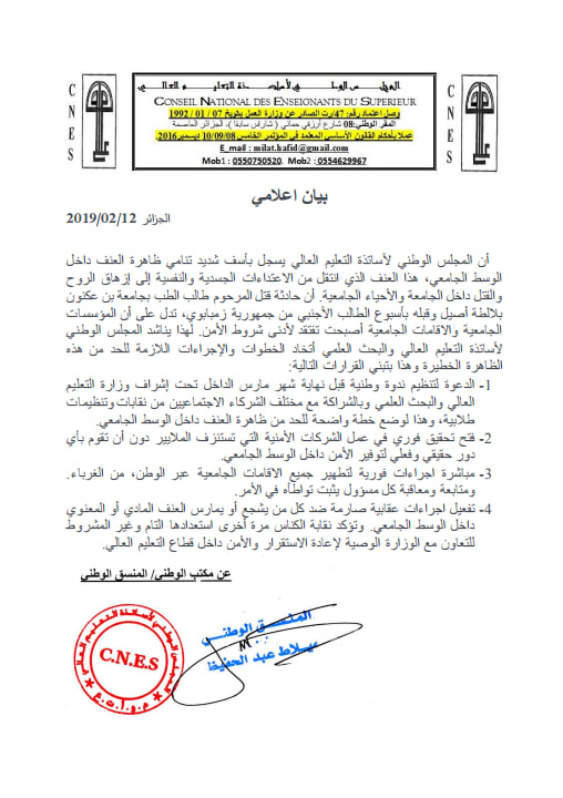 دعا المجلس الوطني لاساتذة التعليم العالي،لتنظيم ندوة وطنية قبل شهر مارس،وذلك لوضع خطة واضحة للحد من ظاهرة العنف داخل الجامعة.