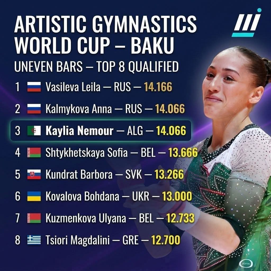 يذكر أن هذه كأس العالم للجمباز الفني، الذي تشارك فيه حاليا كيليا نمور، يجري بمدينة باكو، بأذربيجان.