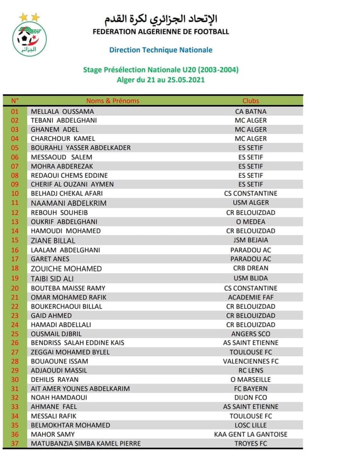 وسينطلق تربص المنتخب الوطني لفئة أقل من 20 سنة ( مواليد 2003 و 2004 ) اليوم الجمعة وسيدوم إلى غاية 25 ماي بحضور المحترفين والذي يبلغ عددهم 13 لاعبا من أندية بايرن ميونيخ، مارسيليا، سانت اتيان و ليل.