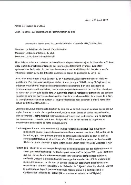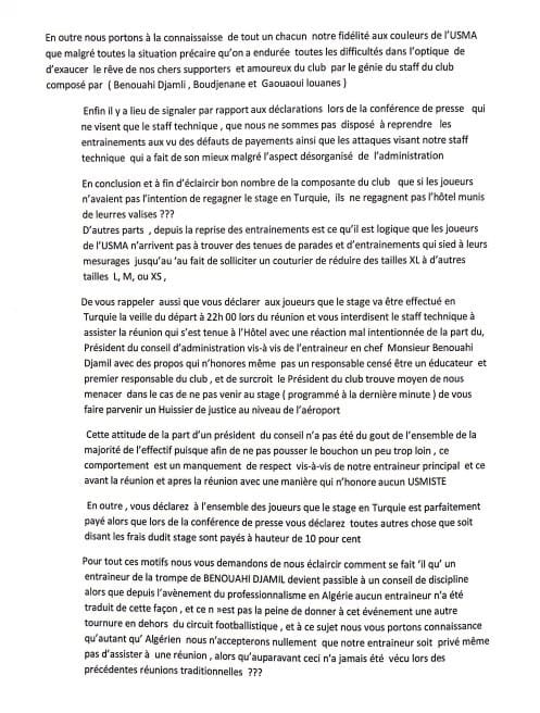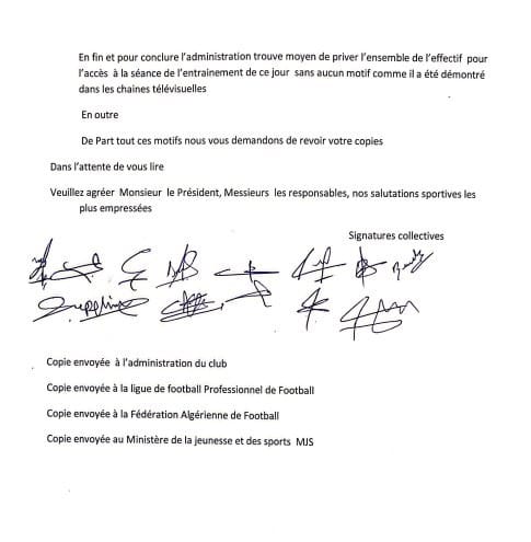 للإشارة، تم إرسال نسخ من البيان، لإدارة النادي، ولإتحاد الجزائري لكرة القدم، والرابطة المحترفة، ووزارة الشباب والرياضة.