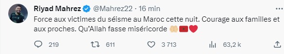 وأطلق نبيل بن طالب، وعدد من العناصر الوطنية، صورا لـ”زلزال” المغرب، عبر خاصية “ستوري” في حساباتهم الشخصية على “أنستغرام” ترحموا من خلالها على أرواح الضحايا، كما تمنوا الشفاء للجرحى، معلنين تضامنهم التام مع الشعب المغربي.