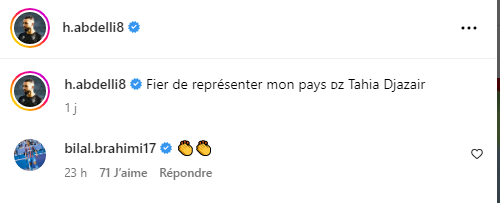 وبعدما نشر عبد اللي حيماد صورة له بقميص المنتخب الوطني على حسابه الرسمي بـ “انستغرام”، تفاعل مهاجم نيس الفرنسي بلال براهيمي معه، بطريقة جميلة حيث وضع رمز “إيموجي” للقوة والتهنئة بمناسبة الخطوة الجديدة في مشواره الكروي.