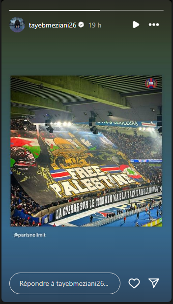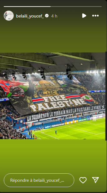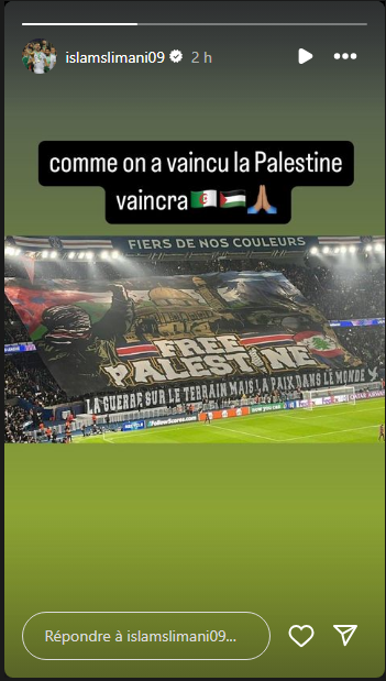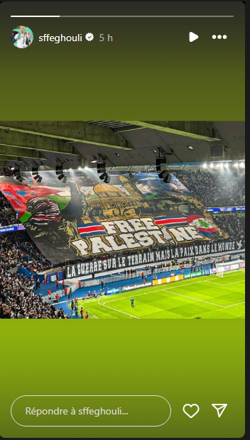 ونشر كل من إسلام سليماني وسفيان فيغولي ويوسف بلايلي وعدد من اللاعبين الذين سبق لهم حمل القميص الوطني مثل الطيب مزياني. صورة “التيفو” الرائع الذي رفعه أنصار نادي العاصمة الفرنسية ويحمل عبارة “الحرية لفلسطين”.