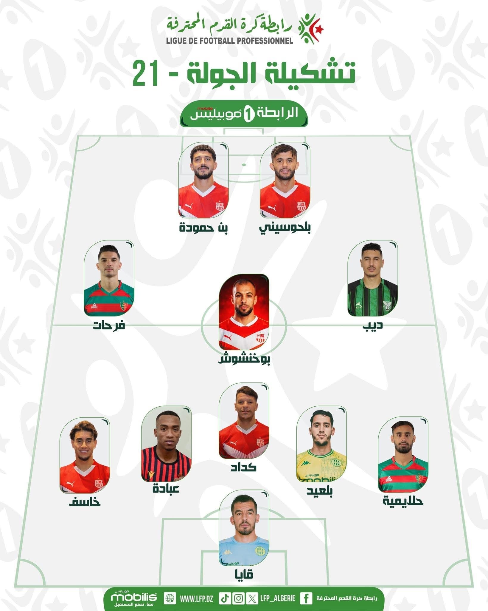 حيث ضمت التشكيلة المثالية كل من نوفل خاسف وشعيب كداد، وسليم بوخنشوش. وثنائي الهجوم بلحوسيني والتونسي بن حمودة، بعد المستويات القوية التي قدموها في قمة الجولة أمام شباب قسنطينة.