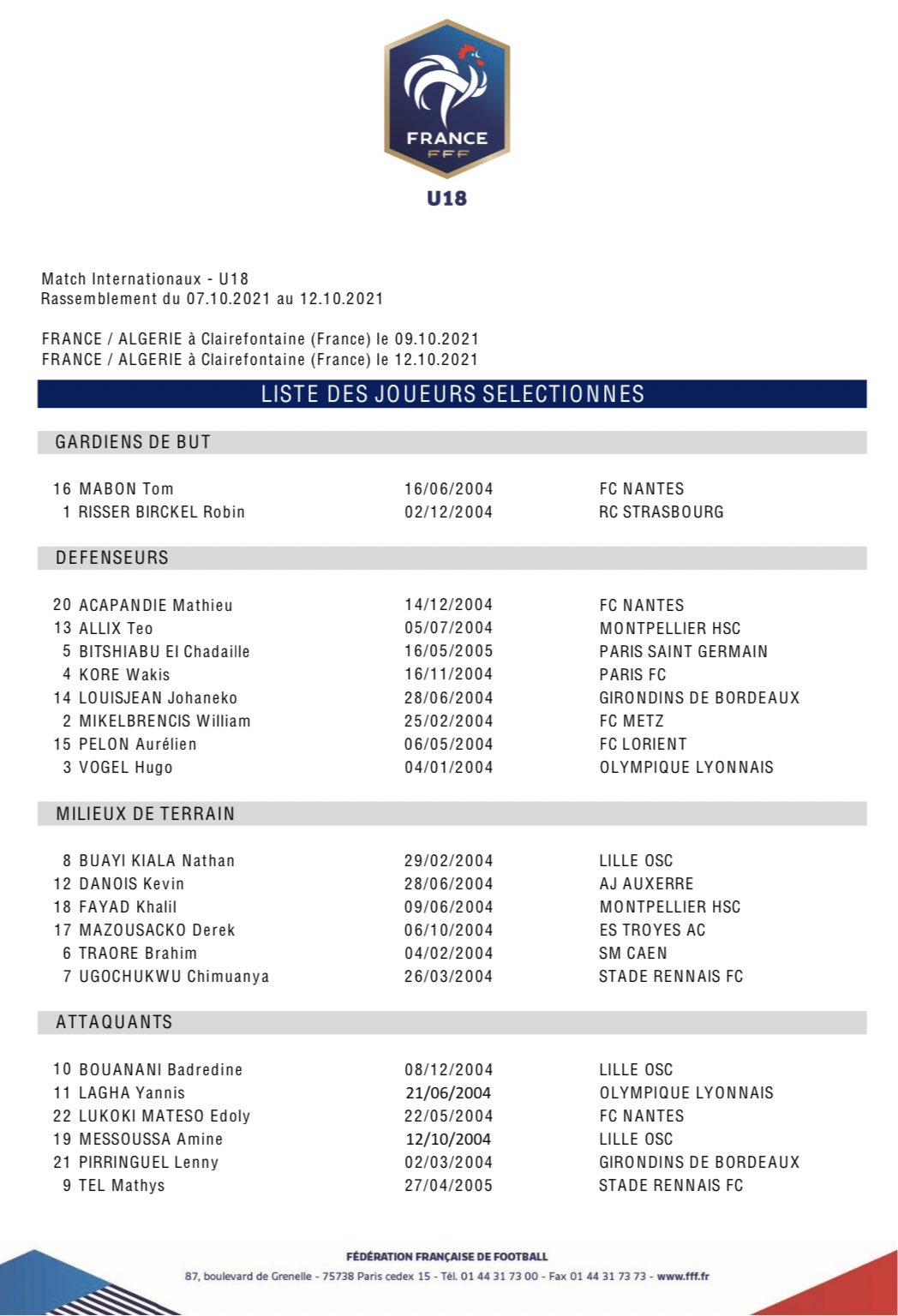 وسيدوم تربص المنتخب الفرنسي لأقل من 18 سنة من ال7 إلى ال12 أكتوبر وسيواجه الخضر يومي ال9 وال12 من ذات الشهر.