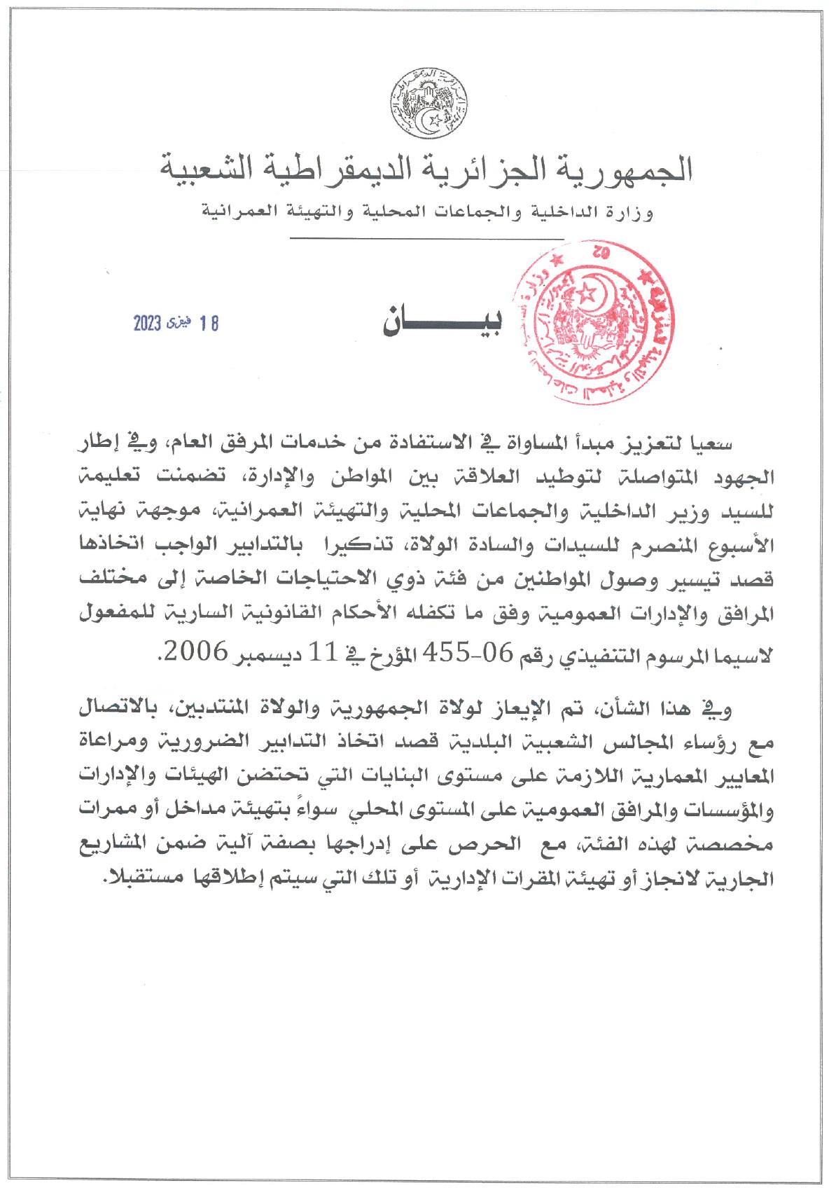 وجهت وزارة الداخلية والجماعات المحلية، والتهيئة العمرانية، تعليمة للولاة، مفادها التدابير الواجب اتخاذها قصد تيسير وصول المواطنين من ذوي الاحتياجات الخاصة. وهذا إلى مختلف المرافق والإدارات العمومية وفق ما تكفله الأحكام القانونية السارية المفعول.