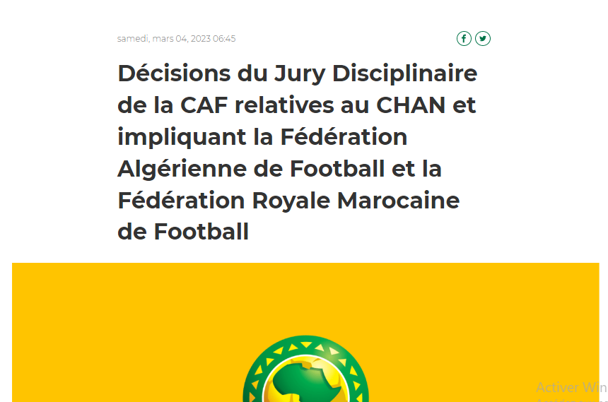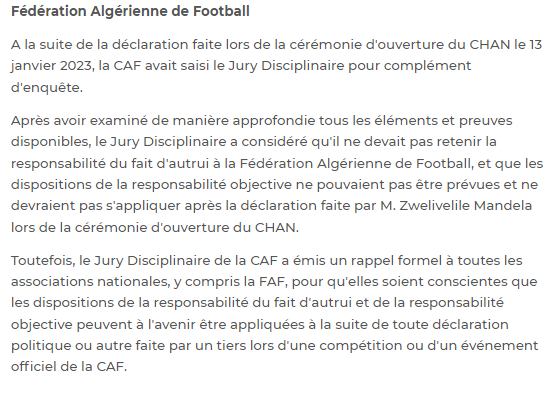 وقالت أن هيئة المحلّفين التأديبية في الكاف بعدم تحميل أي مسؤولية للإتحاد الجزائري لكرة القدم بسبب خطاب حفيد مانديلا في افتتاح الشان.