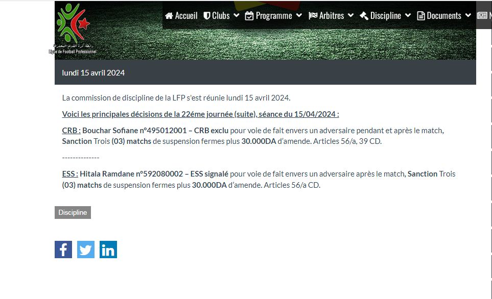 وقررت ذات الهيئة، حسبما جاء في الموقع الالكتروني للرابطة، إيقاف كل من بوشار وحيتالة لـ 3 مباريات كاملة، وتغريمهما بـ 3 ملايين سنتيم.