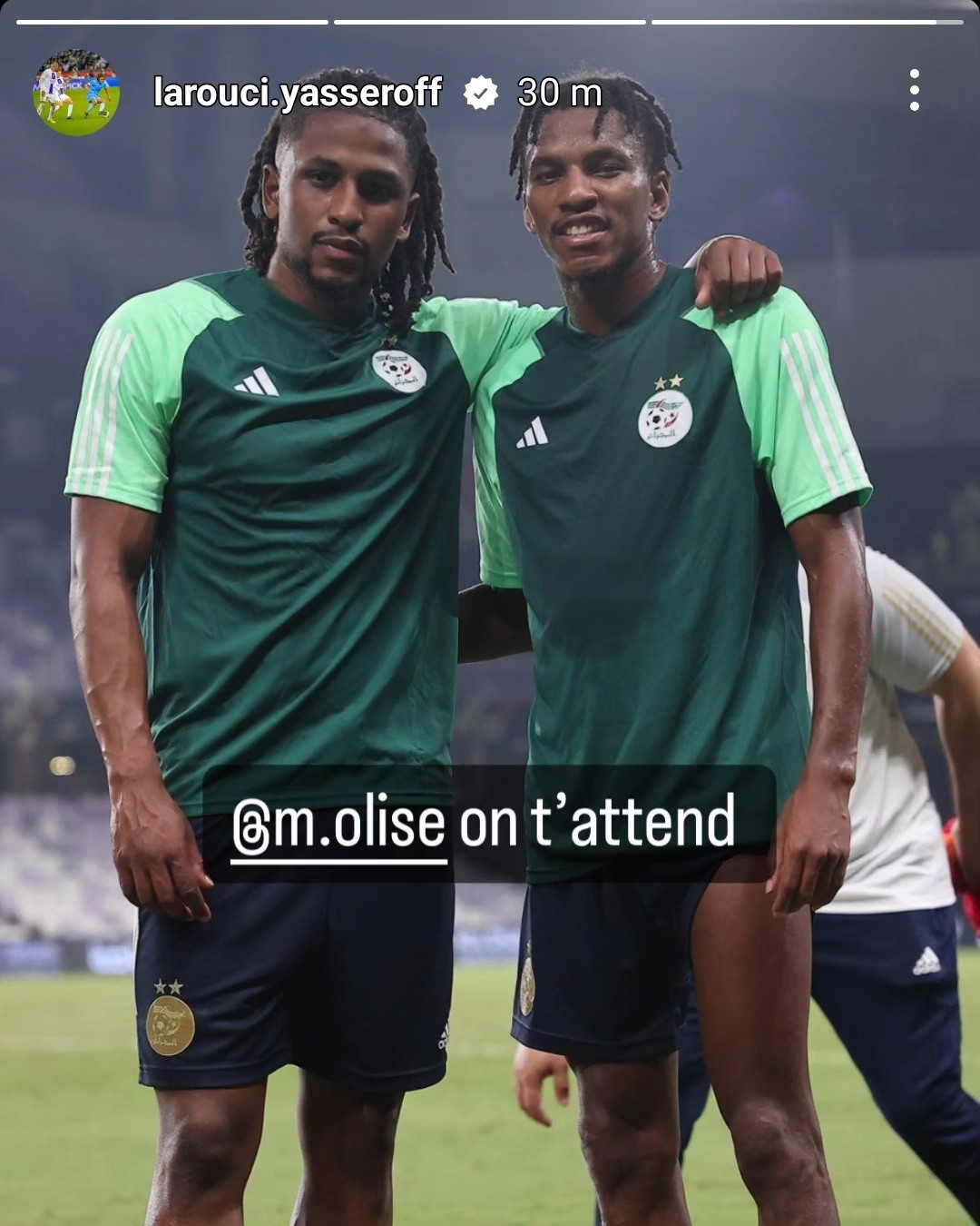 و وضع ياسر لعروسي صورة له برفقة النجم الجزائري الآخر هشام بوداوي عبر حسابه الرسمي “انستغرام”، أين عمل “منشن” لصديقه الناشط في الدوري الإنجليزي و كتب عليها ” ميشال أوليز .. نحن في انتظارك”، و هي الرسالة التي قد تصل أوليز و تكون لها الفضل الكبير في اختياره تمثيل الألوان الوطنية.
