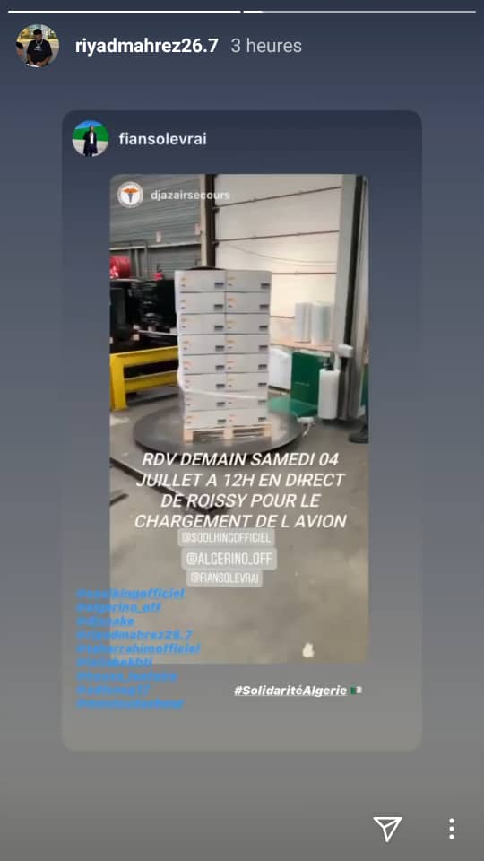 “رياض محرز” كشف عبر ستوري صفحته الرسمية في موقع التواصل الاجتماعي “أنستغرام” موعد نقل المساعدات التي ساهم فيها النجم الدولي الجزائري Dj snak وعديد الفنانين والرياضيين الجزائريين.