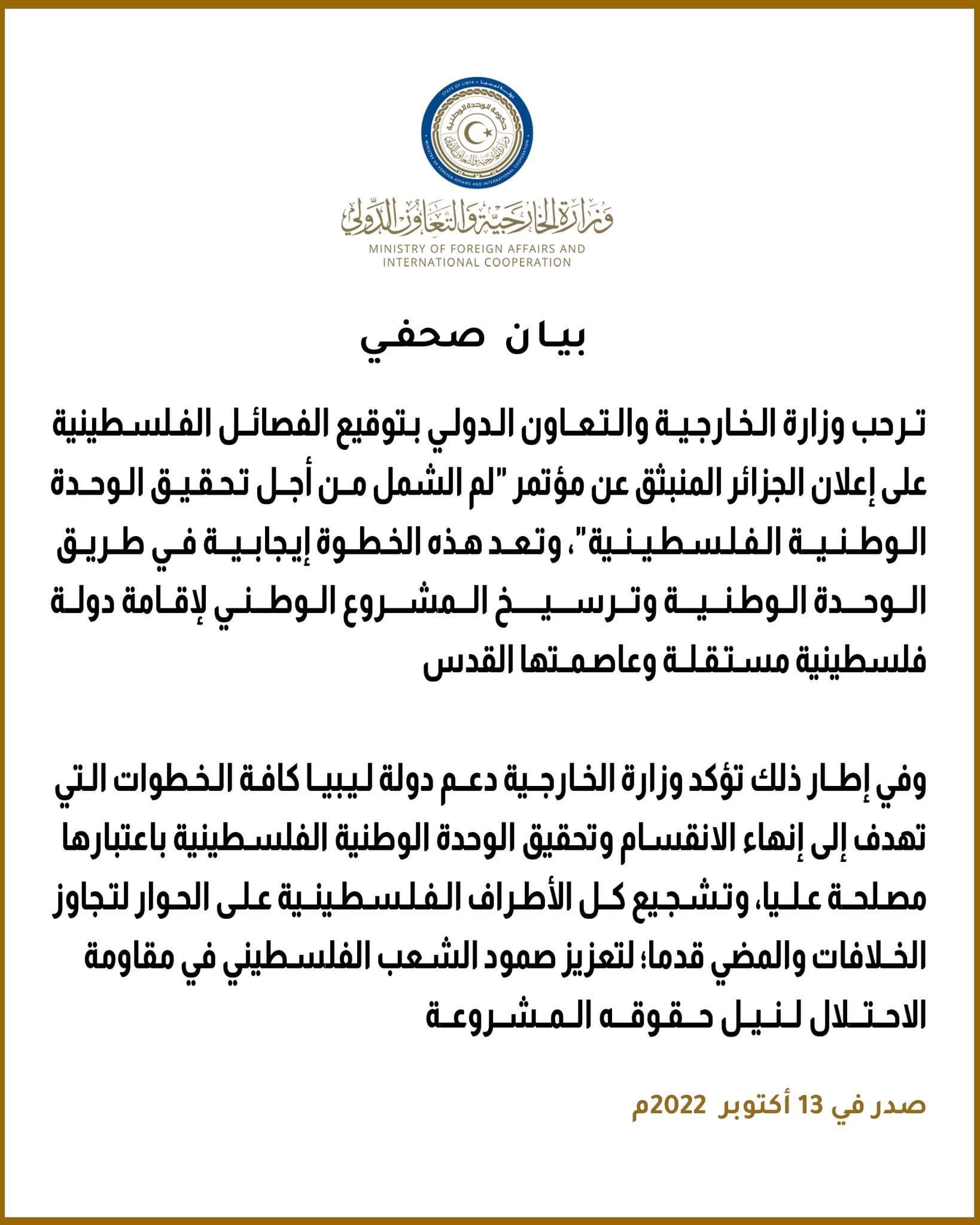 رحبت ليبيا بتوقيعَ الفصائل الفلسطينية لوثيقة “إعلان الجزائر” المنبثقة عن مؤتمر لم الشمل من أجل تحقيق الوحدة الوطنية الفلسطينية. التي جرت في الجزائر برعاية رئيس الجمهورية عبد المجيد تبون.