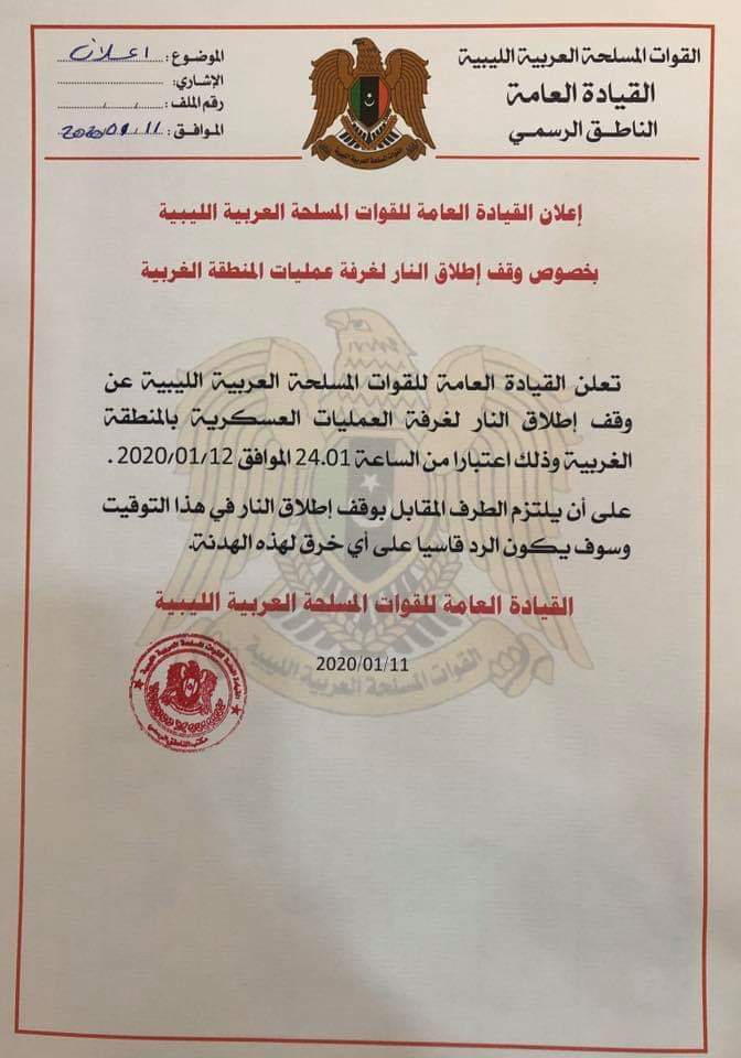 أعلن الناطق بإسم القيادة العامة للقوات المسلحة العربية الليبية أن اللواء المتقاعد خليفة حفتر قرر وقـف إطلاق النـار في ليبيا وعلى جميع محاور القتال.