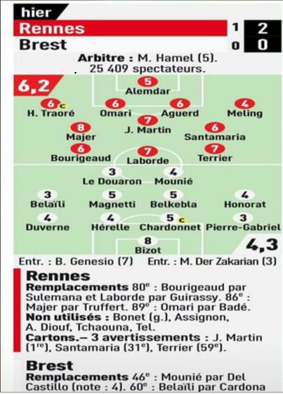وكشفت صحيفة “ليكيب الفرنسية”، عن تنقيط لاعبي بريست، ورين، في المواجهة التي جمعتهما أمس الأحد ضمن الليغ1 الفرنسية