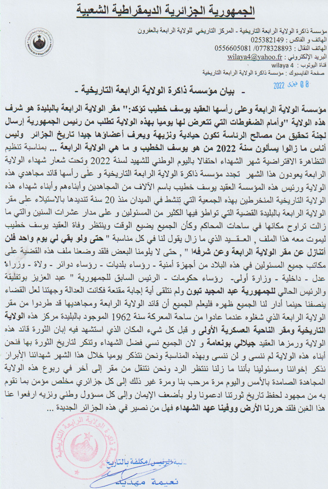 وجاء في بيان أصدرته مؤسسة “الولاية الرابعة التاريخية”، تحوز “النهار” على نسخة منها، أنه بمناسبة تنظيم التظاهرة الافتراضية شهر الشهداء احتفالا باليوم الوطني للشهيد سنة 2022، وتحت شعار “شهداء الولاية الرابعة يعودون هذا الشهر”، تجدد مؤسسة “ذاكرة الولاية الرابعة التاريخية”، وعلى رأسها قائد مجاهدي هذه الولاية، ورئيس هذه المؤسسة، العقيد يوسف خطيب، ونيابة عن جميع المجاهدين وأبنائهم وأبناء شهداء هذه الولاية التاريخية المنخرطين بالجمعية التي تنشط في الميدان منذ 20 سنة، تنديدها بالاستيلاء على مقر الولاية الرابعة في البليدة.