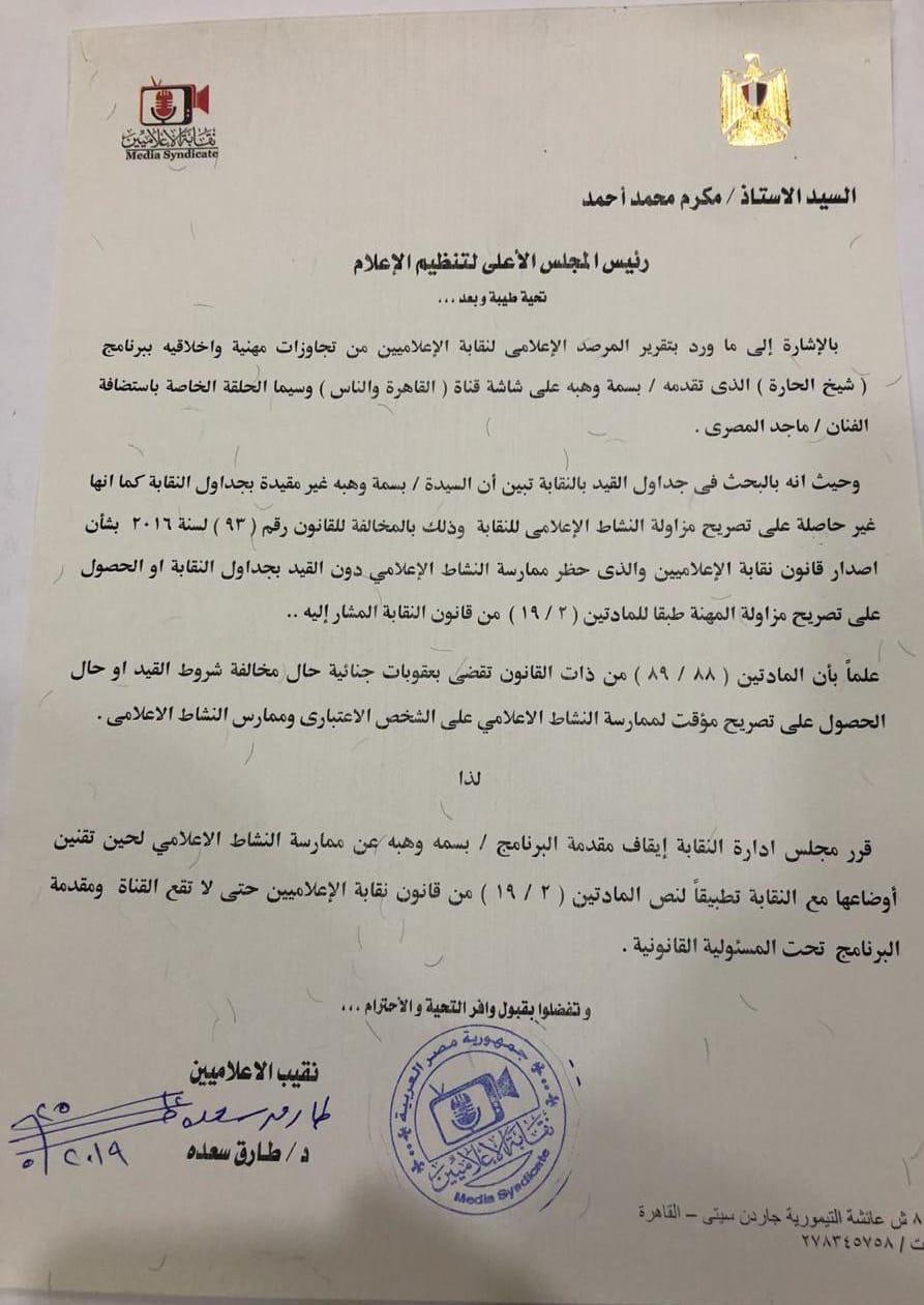 لكن ورغم إعتذاره للجمهور ، إلا أن طارق سعدة، نقيب الإعلاميين، قد أصدر بيانا قال فيه إن مجلس نقابة الإعلاميين، إتخذ قرارا بإيقاف المذيعة بسمة وهبة التي استضافت ماجد المصري عن ممارسة النشاط الإعلامي.