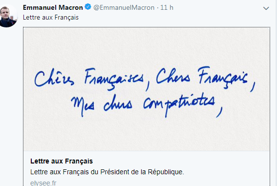 وقد أعلن ماكرون في رسالة نشرتها الرئاسة و المواقع الالكترونية و القنوات ، عن بدء في “حوار وطني كبير ” بداية من يوم الثلاثاء المقبل لغاية الـ 15 من شهر مارس المقبل.