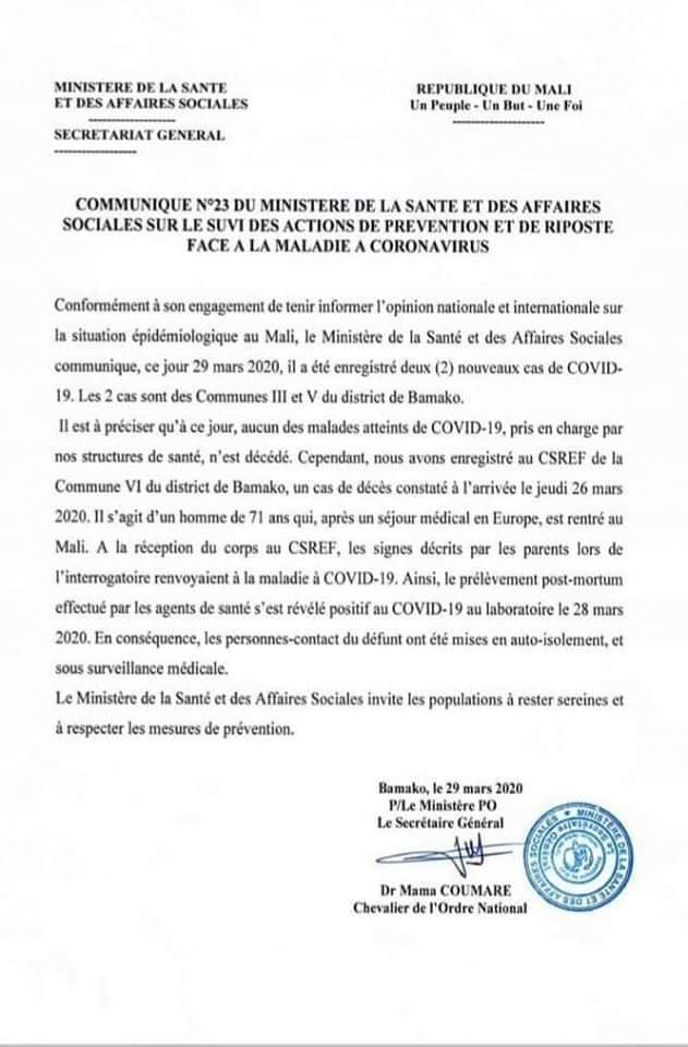 أعلنت وزارة الصحة في مالي اليوم الأحد عن إرتفاع عدد المصابين بفيروس كورونا إلى 20 حالة وتسجيل أول وفاة.