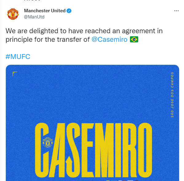 كشفت إدارة مانشستر يوناتيد عن توصلها إلى إتفاق مع نظيرتها من ريال مدريد لضم الدولي البرازيلي الناشط في الفريق الإسباني كارلوس كاسيميرو.