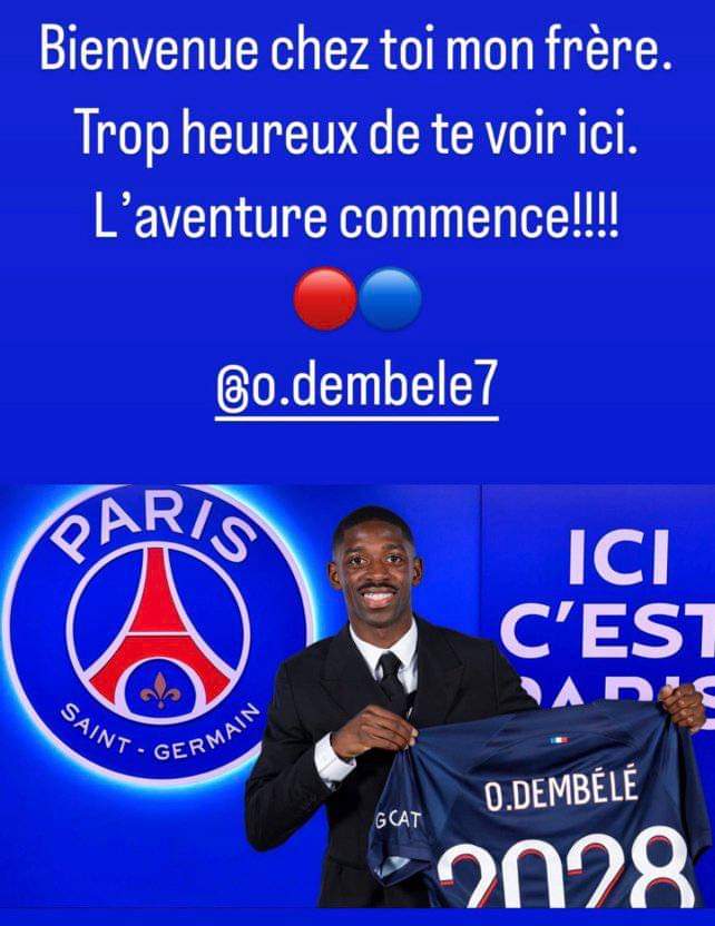 ونشر مبابي عبر ستوري حسابه على الأنستغرام، صورة ديمبيلي بقميص البياسجي على هامش تقديمه كلاعب جديد:”مرحبا بك في منزلك أخي، سعيد جدا رؤيتك هنا المغامرة تبدأ الآن”.