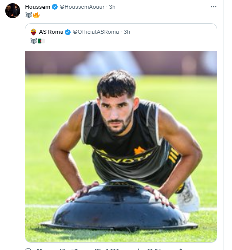 أبدى الدولي الجزائري حسام عوار فخره الكبير بتمثيل الجزائر في النادي العريق روما الإيطالي عبر منشور له اليوم الأحد.