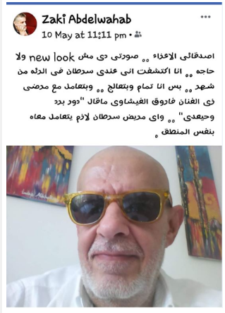 وذلك بعدما نشر صورة له عبر حسابه على “فيسبوك” وهو حليق الرأس، مؤكدا لأصدقائه أن هذا ليس شكلا جديدا له، وإنما جاء بعد اكتشافه إصابته بمرض السرطان.