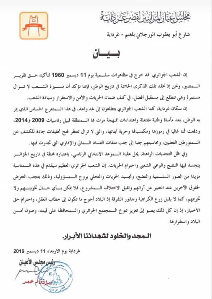 وقال مجلس أعيان المزابيين في بيان له اليوم ،أن الشعب الجزائري سيقدم مزيدا من صور السليمة والنضج والتحري بالمسؤولية وتجسيد الحريات.