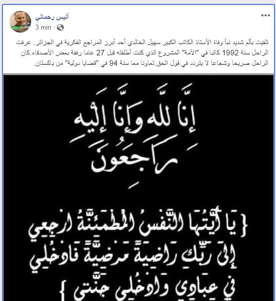 ونشر الزميل أنيس رحماني على صفحته الرسمية في فايسبوك: تلقيت بألم شديد نبأ وفاة الأستاذ الكاتب الكبير سهيل الخالدي أحد أبرز المراجع الفكرية في الجزائر. عرفت الراحل سنة 1992 كاتبا في “الأمة” المشروع الذي كنت أطلقته قبل 27 عاما رفقة بعض الأصدقاء.