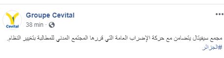 ونشر المجمع، على صفحته، بفيسبوك ” مجمع سيفيتال يتضامن مع حركة الإضراب العامة التي قررها المجتمع المدني للمطالبة بتغيير النظام”.