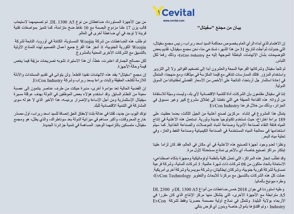 وإختتم مجمع سيفيتال بيانها بان لديهم ثقته في العدالة الجزائرية في إنصاف ربراب اول مصدر خارج المحروقات واكبر مساهم في البلاد.