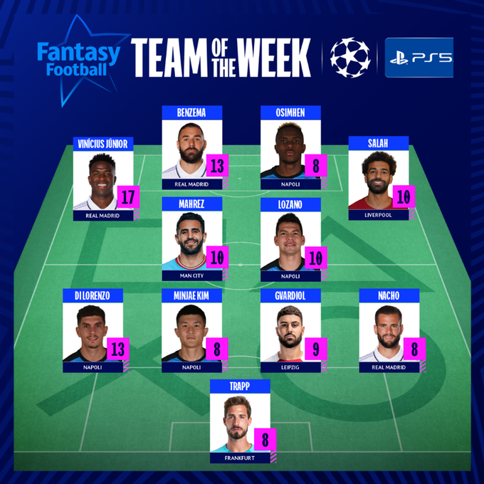 وحسبما أعلنه الحساب الرسمي لرابطة أبطال أوروبا، فإن رياض محرز تواجد في التشكيلة رفقة المتألقين مثل بن زيمة و فينيسيوس، من جانب ريال مدريد. و محمد صلاح من جانب ليفربول.
