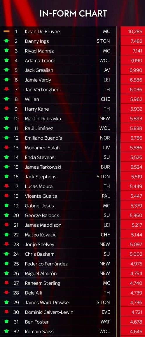 ويتواجد عدد من اللاعبين في أفضل فورمة هذا الموسم، حيث أن “كيفن دي بروين” نجم “السيتي” يتصدر الترتيب بفارق كبير عن “داني إينغز” لاعب “ساوثامبتون”.
