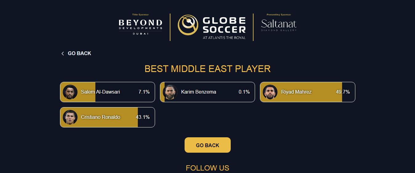 وتم كخطوة أولى، ترشيح 7 لاعبين لجائزة أفضل لاعب في الشرق الأوسط لسنة 2025. يتقدمهم رياض محرز. الذي حظي بتصويت الجماهير. رفقة كريستيانو وبن زيمة والدوسري. في انتظار رأي لجنة التحكيم ولجنة الخبراء.