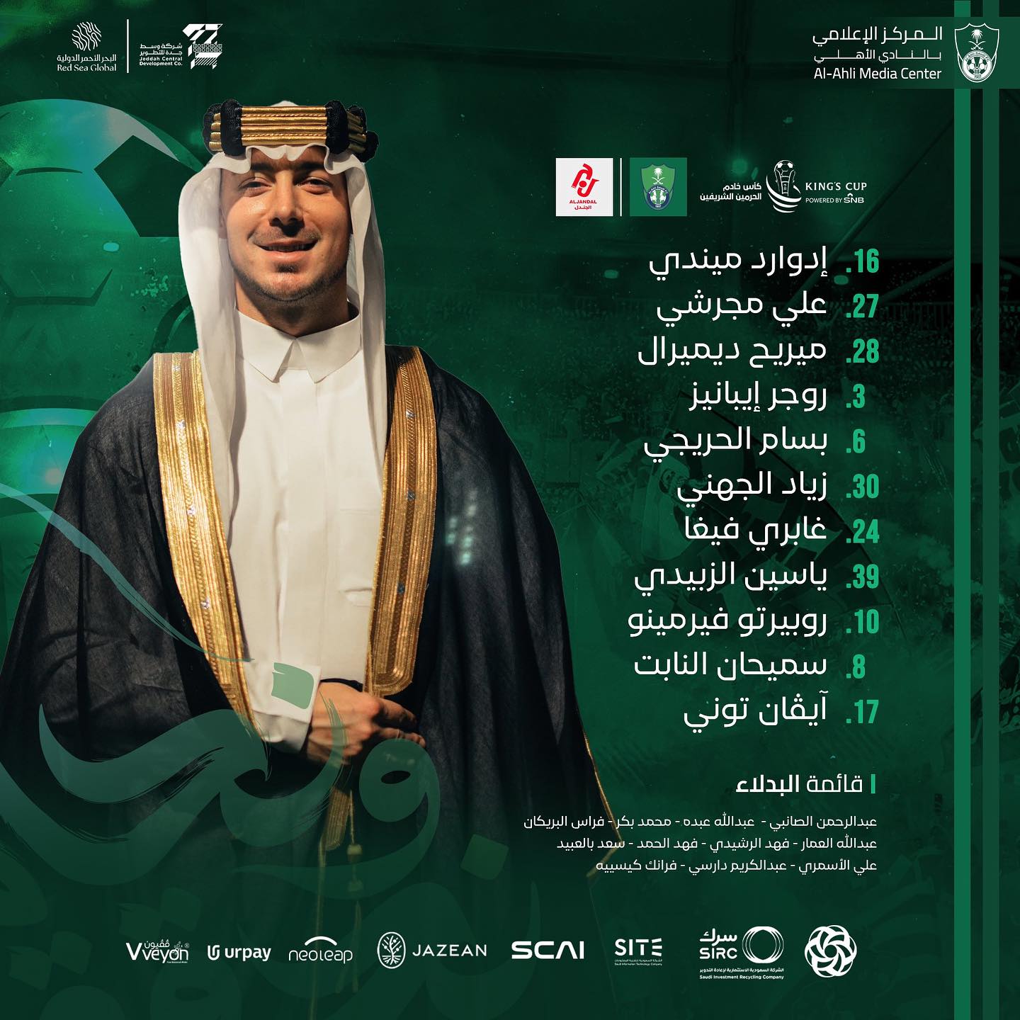 كما أعلنت الصفحة الرسمية للفريق، عن التشكيلة الرئيسية التي يعتمد عليها المدرب يايسله في مواجهة نادي جندل التي عرفت غياب محرز.