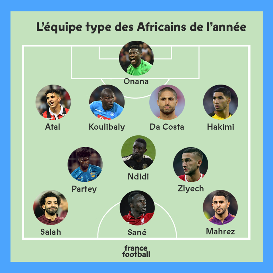 وضمت التشكيلة 4 أسماء عربية أخرى هم المصري محمد صلاح والثلاثي المغربي حكيم زياش، مروان دا كوستا وأشرف حكيمي.