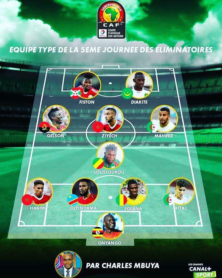 إختارت قناة كانال + الفرنسية الثنائي الجزائري يوسف عطال ورياض محرز في التشكيلة المثالية للجولة الخامسة من التصفيات المؤهلة لنهائيات كأس أمم إفريقيا.