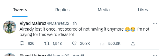 ردّ الدولي الجزائري رياض محرز على إدارة “تويتر” بطريقته الخاصة غرضها السخرية بعد حذف الشارة الزرقاء من صفحته الرسمية.