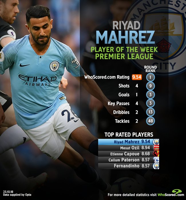 تم اختيار النجم الجزائري “رياض محرز” كأفضل لاعب في الجولة الـ “9” من الدوري الإنجليزي، أين تفوق على نجوم “البريميرليغ” بجدارة.