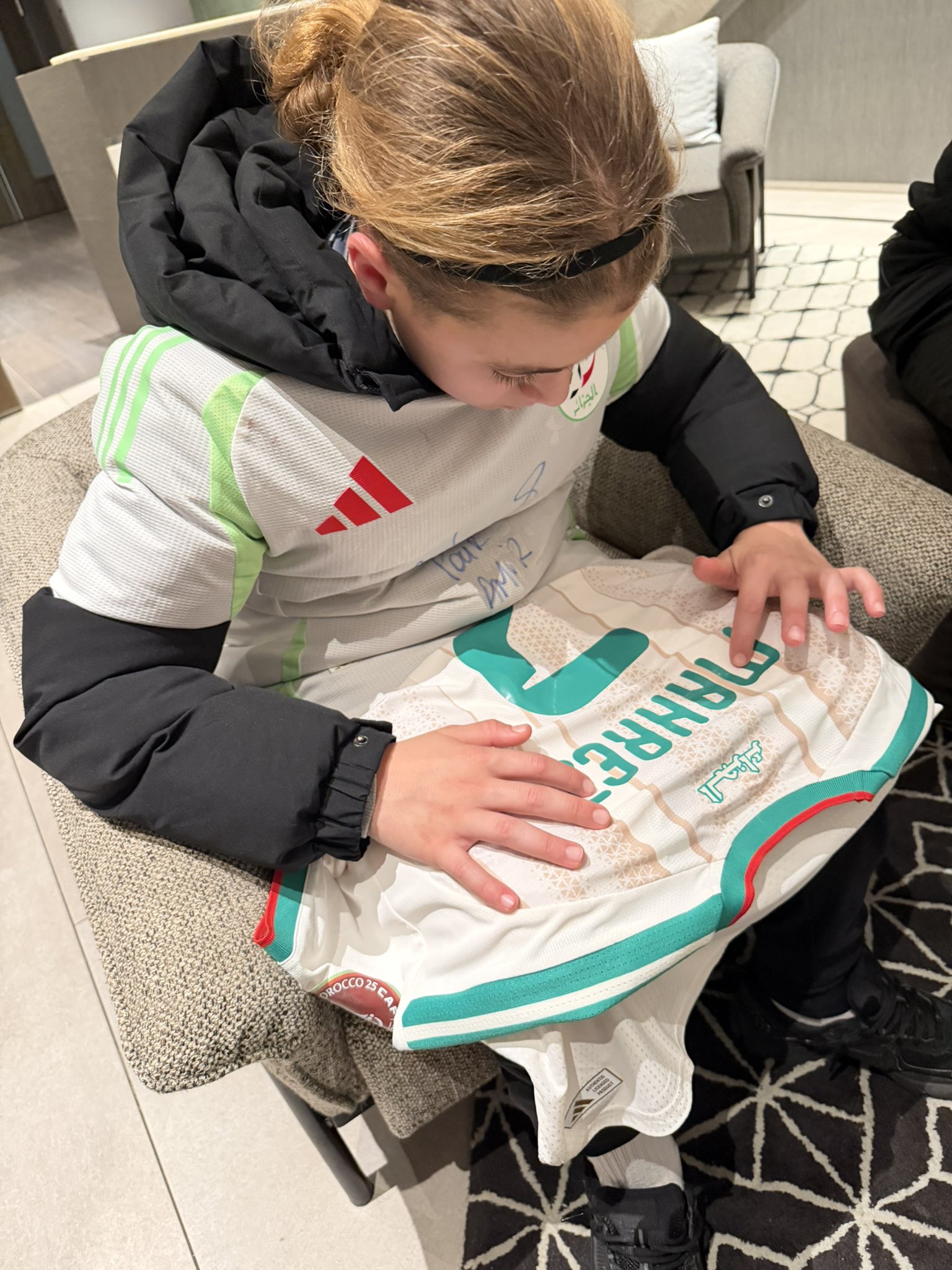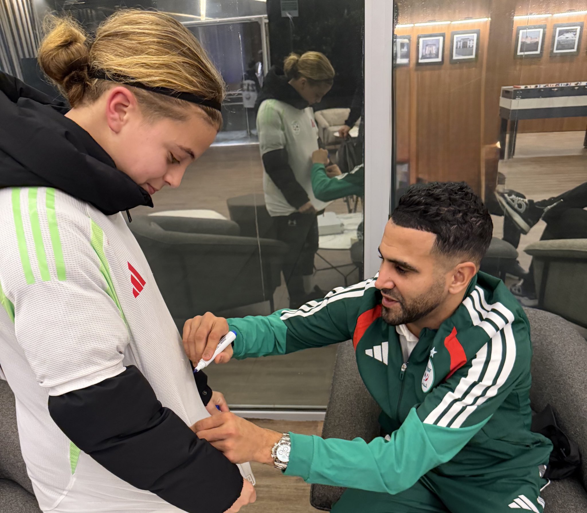 وحرص قائد الخضر، على تحقيق حلم الطفل الجزائري، بأخذ صورة تذكارية معه، واهدائه قميصه الشخصي.