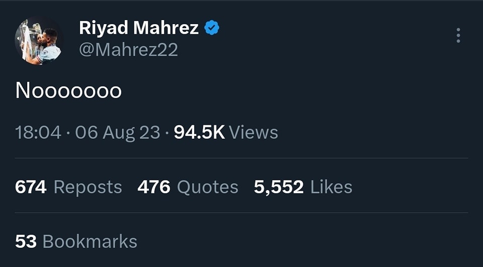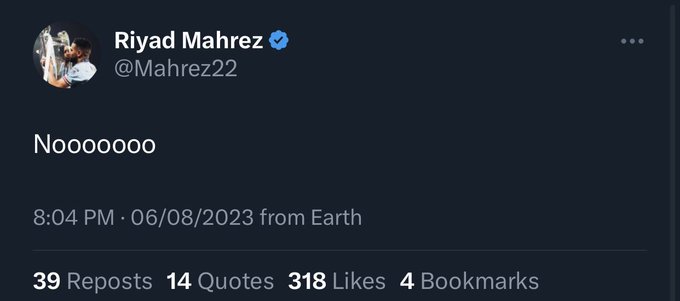 وقام رياض محرز بنشر تغريدة على صفحته الرسمية على “تويتر” بعد ثواني فقط من تعادل أرسنال في الدقائق الأخيرة من اللقاء المثير الذي جرى بملعب ويمبلي الشهير.