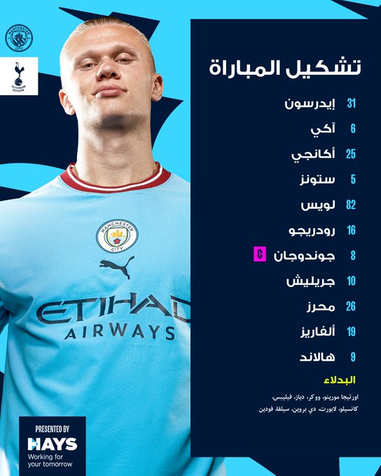 كشف الحساب الرسمي لفريق مانشستر سيتي عن التشكيلة الأساسية التي ستواجه توتنهام هوتسبير.
